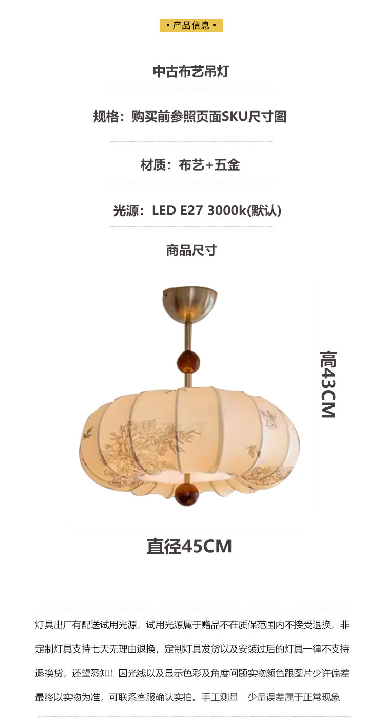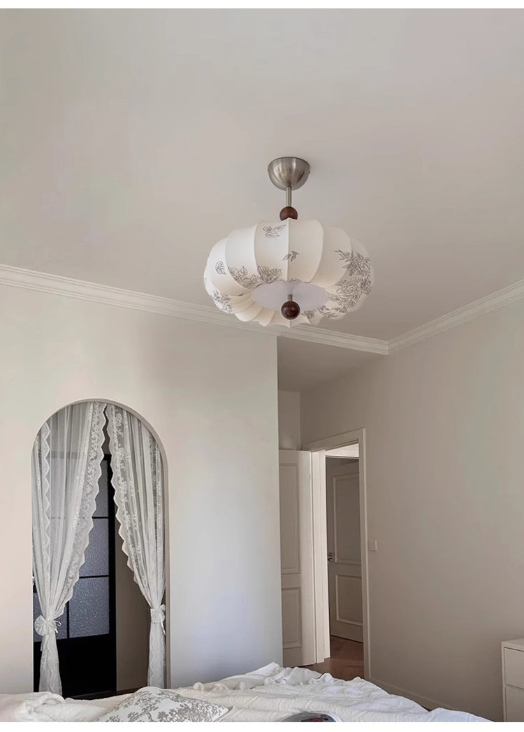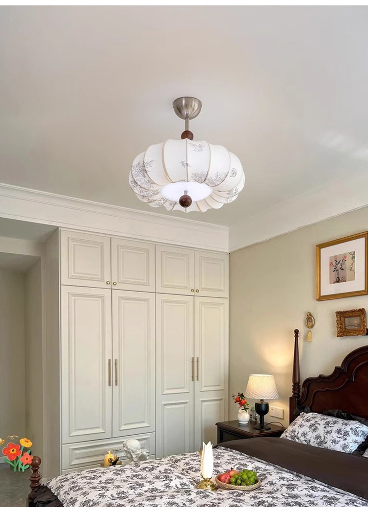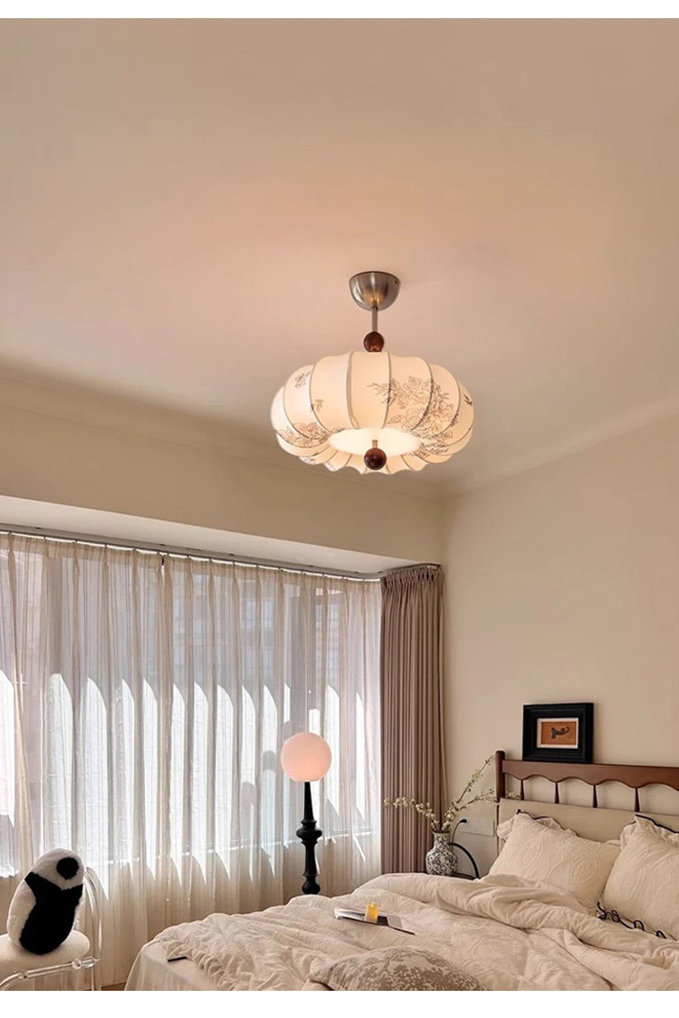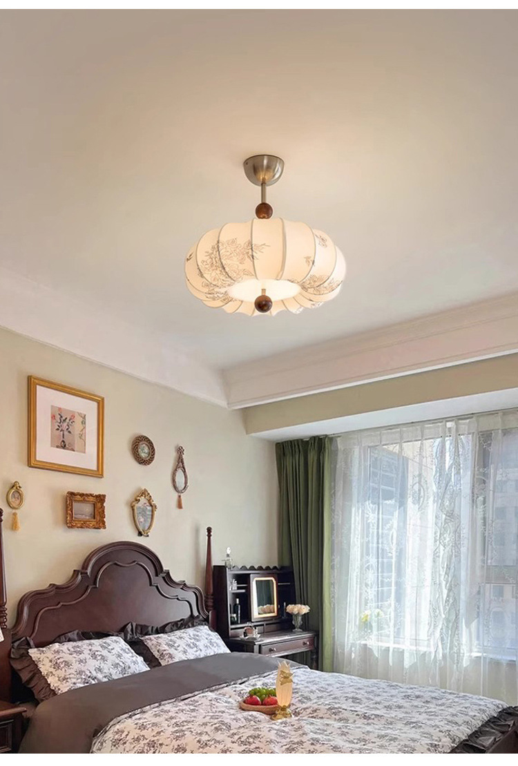 复古卧室灯实木南瓜吊灯法式风卧室吊灯花纹布艺南洋风温 馨浪漫灯