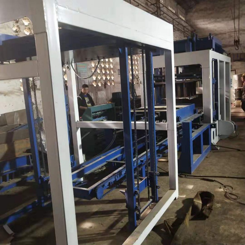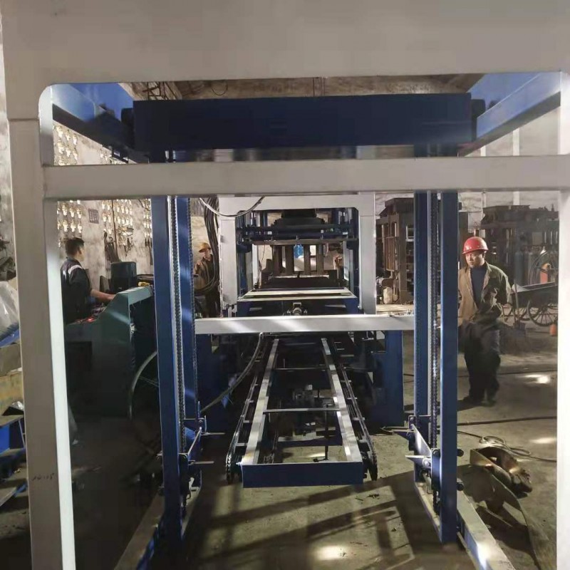 6、振动成型系统:该机振动台采用高强度一体化铸钢,台面振动加压成型,料车采用强制360度旋转搅拌装置,成型周期短、生产效率高、砌块质量密实强度高、尺寸准确。