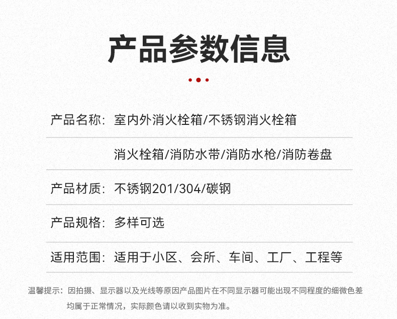 规格800*650*240全红消防栓箱,800*650*240全红消防栓箱(加厚),1000*700*240全红消防栓箱,1600*700*240全红消防栓箱,1800*700*240全红消防栓箱,800*650*240透明消防栓箱,1000*700*240透明消防栓箱,1600*700*240透明消防栓箱,1800*700*240透明消防栓箱,8-50-25(含接扣含水枪),8-65-25(含接扣含水枪),8-65-30(含接扣含水枪),8-80-25(含接扣含水枪),10-65-25(含接扣含水枪),13-65-25(含接扣含水枪 ),20-65-20(含国标接扣含水枪),25-65-20(含国标接扣含水枪)
