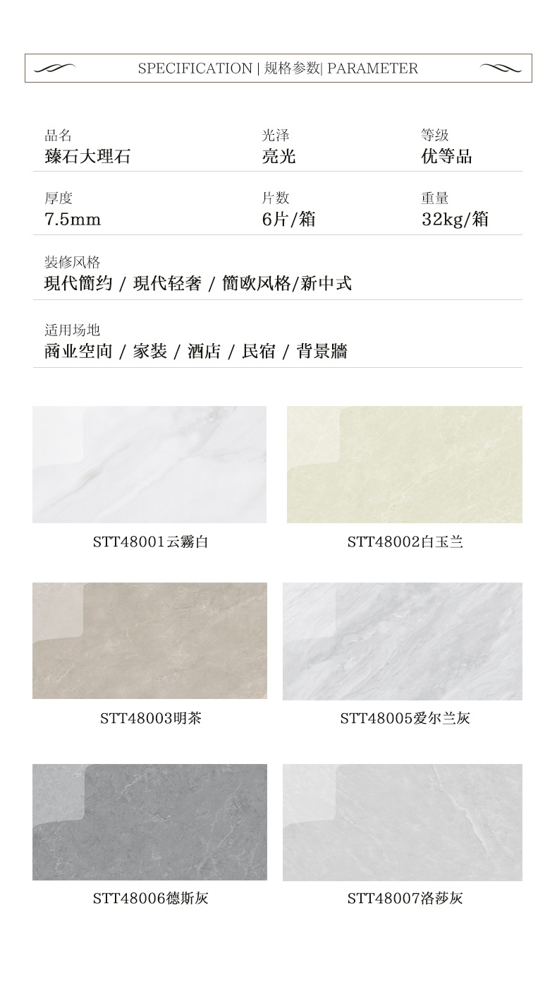 色系STT48001云雾白,STT48002白玉兰,STT48003明茶,STT48005爱尔兰灰,STT48006德斯灰,STT48007洛莎灰